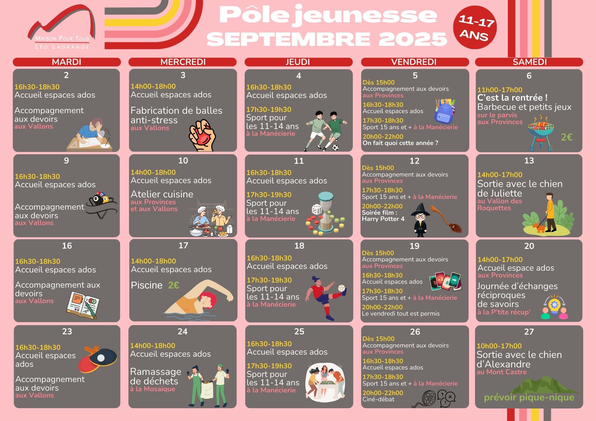 Le programme des animations de septembre pour les 11-17 ans est téléchargeable ici